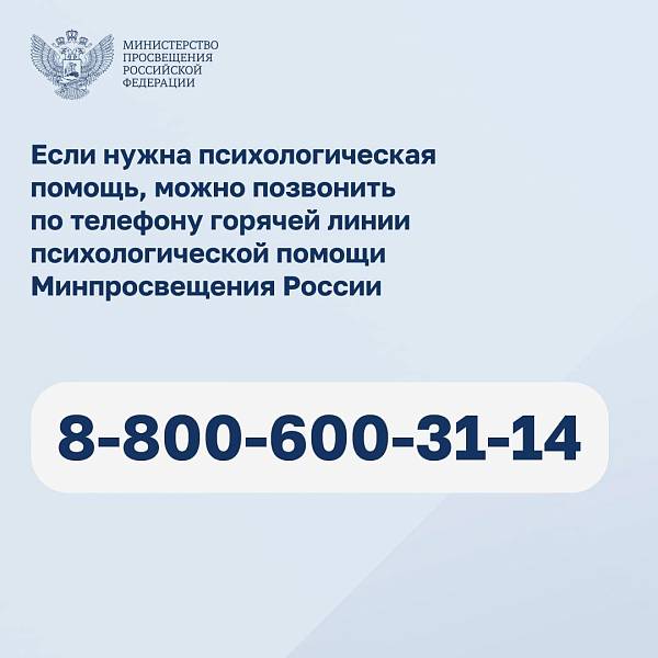 За психологической помощью можно обратиться по телефону горячей линии Минпросвещения России: 8-800-600-31-14.