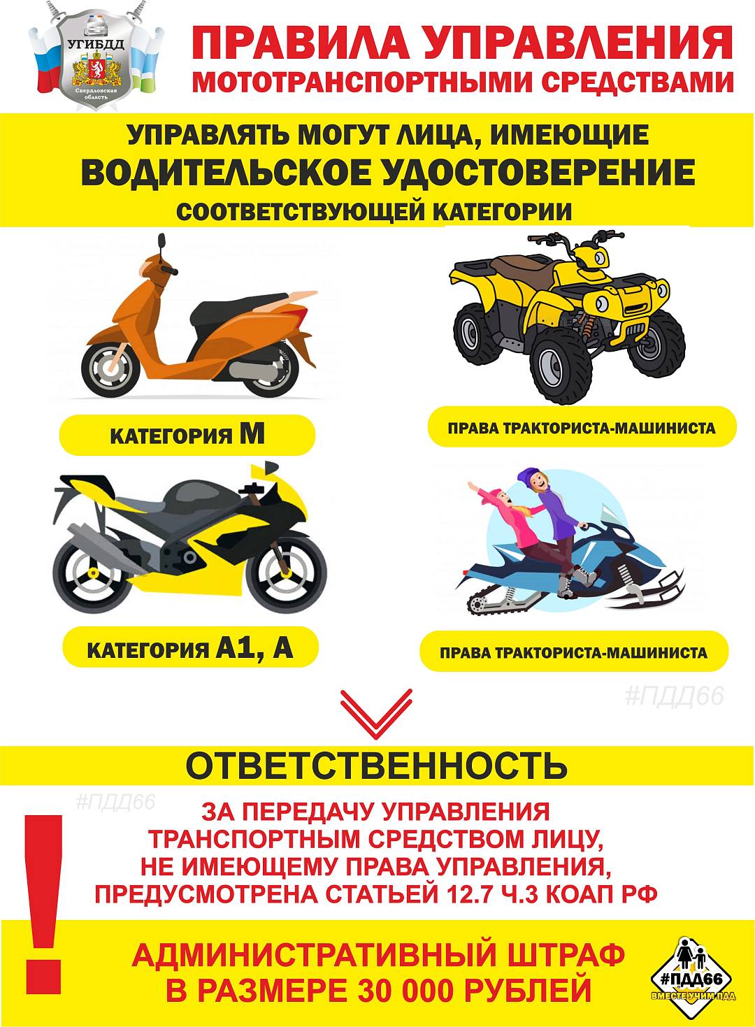 ГИБДД напоминает, что на основании части 1 статьи 12.7 Кодекса Российской Федерации об административных правонарушениях «За управление транспортным средством водителем, не имеющим права управления или не имеющим соответствующий категории» предусмотрена ответственность в виде штрафа в размере от 5000 до 15000 рублей с задержанием транспортного средства и помещением его на специализированную стоянку.