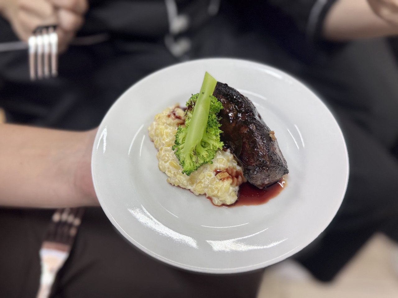 - Говяжья печень с ризотто и соусом.