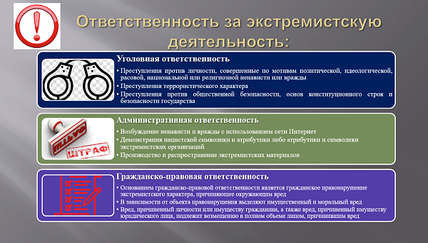 - Статья 282.1 УК РФ. Предусмотрена уголовная ответственность за создание экстремистского сообщества и участие в нём. Наказание включает штраф, принудительные работы или лишение свободы.