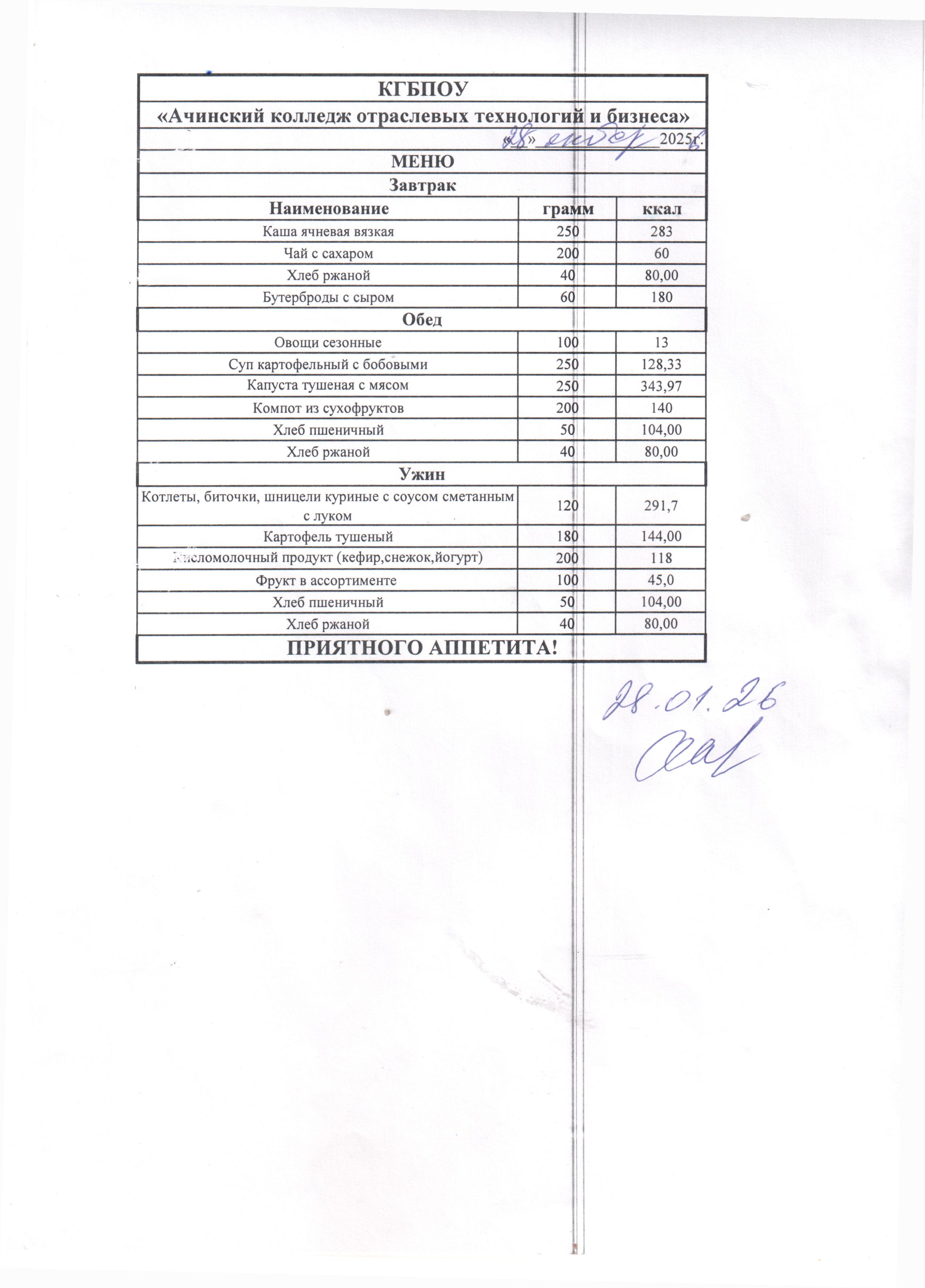 Меню ежедневного горячего питания